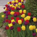Een mix van heldergele, rode en paarse Triumph tulpen. Mooie contrasterende gekleurde bloemen op stevige stelen die wekenlang voor een prachtig kleurenpalet zorgen.